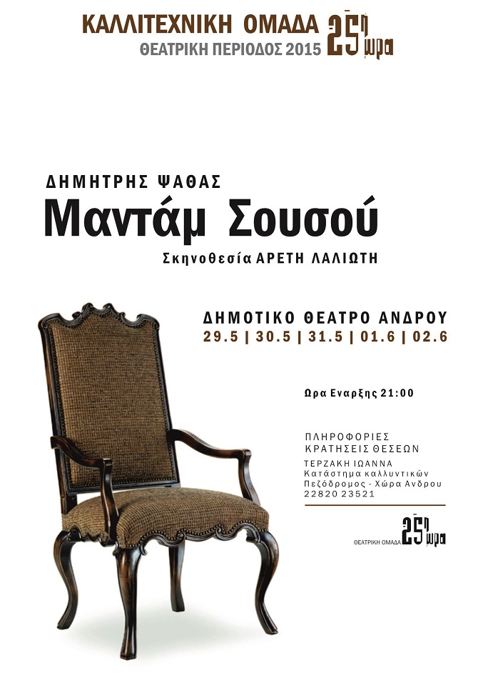 Με σεβασμό λοιπόν  στο κείμενο, αλλά και μεγάλη αγάπη για τον συγγραφέα, σας παρουσιάζουμε εφέτος την ιστορία της Μαντάμ Σουσούς. Μια ιστορία που πριν φτάσει στη δική μας παράσταση πέρασε από το ελληνικό θέατρο, τον ελληνικό κινηματογράφο, αλλά και την ελληνική τηλεόραση με τεράστια επιτυχία.