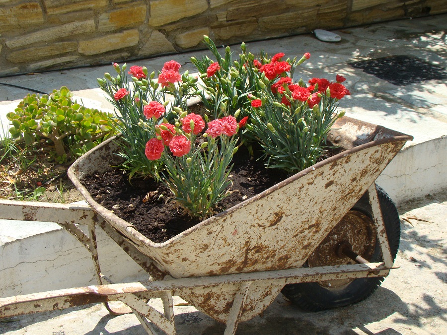Η πρώτη έκπληξη με περίμενε έξω από τα ενοικαζόμκενα του: ένα παλιό καρότσι οικοδομικών εργασιών-γλάστρα με γαρύφαλα! Δεν παρκάρουν αυτοκίνητα και ειναι μια ομορφιά!