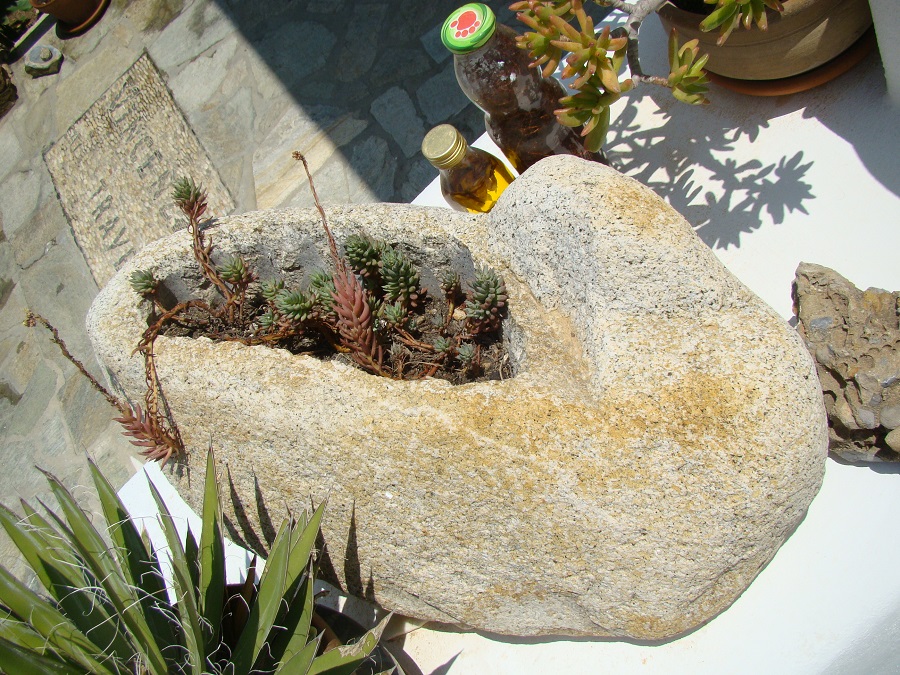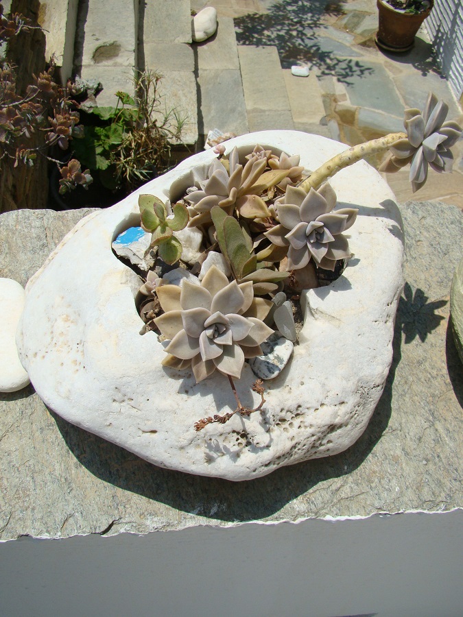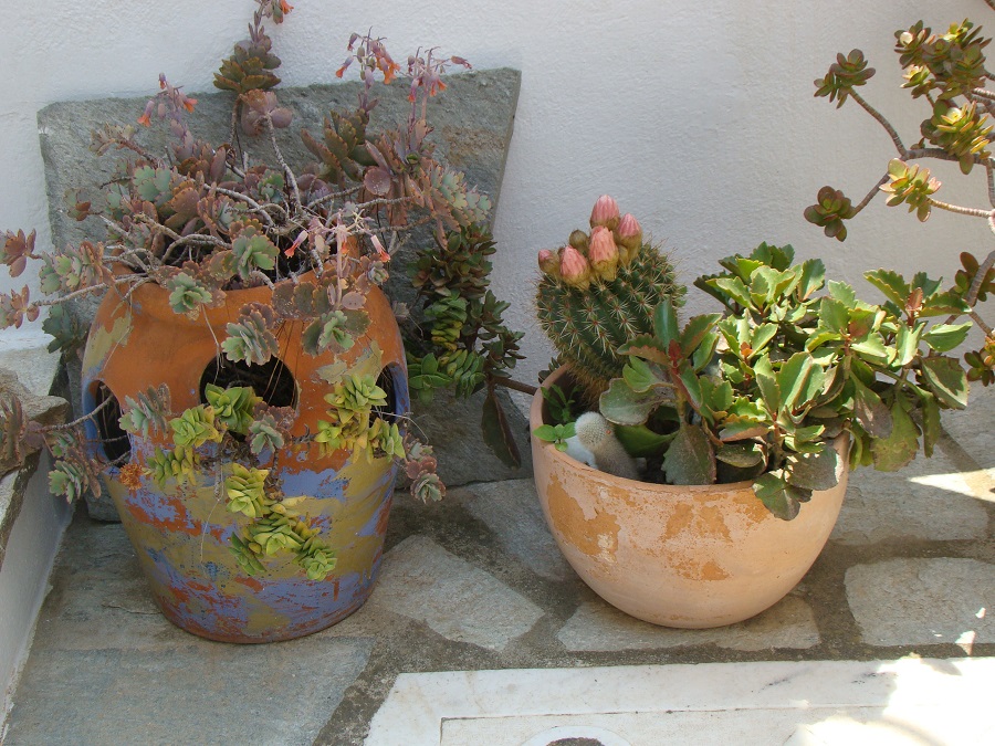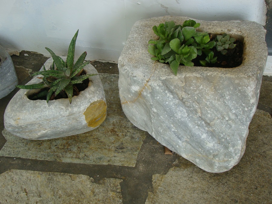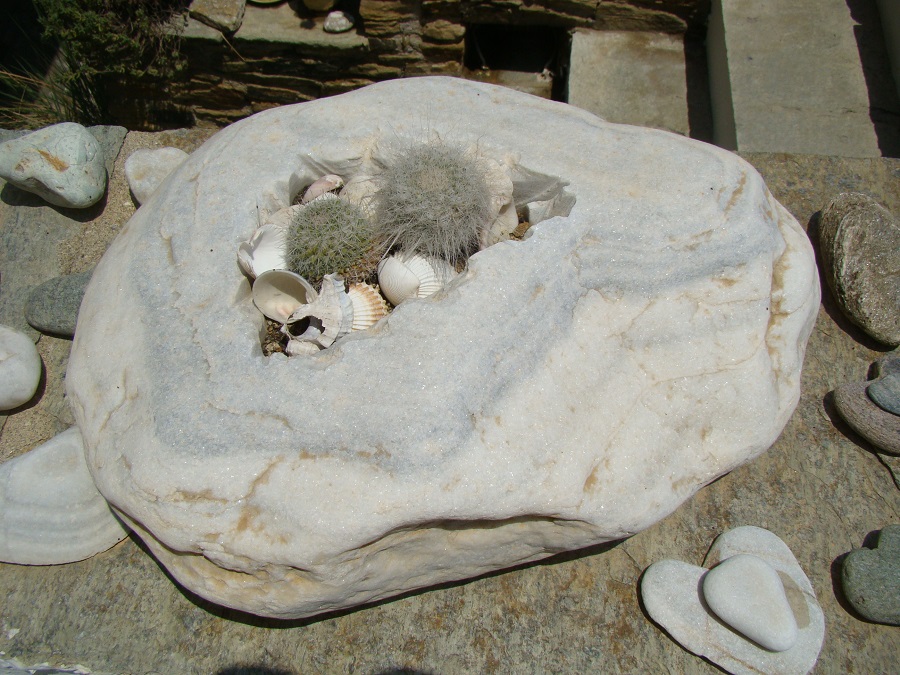 Και μια ατέλειωτη ποικιλία από γλάστρες πέτρες ή κομμάτια από μάρμαρο. Στην Τήνο ως γνωστό δουλεύουν ακόμα το μάρμαρο. Και ο Γιάννης έχει χρησιμοποιήσει όλων των ειδών τα κομμάτια μάρμαρο που περισσέυουν δημιουργώντας κοιλώματα που μέσα φυτεύει ...κακτοειδή!