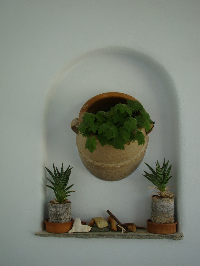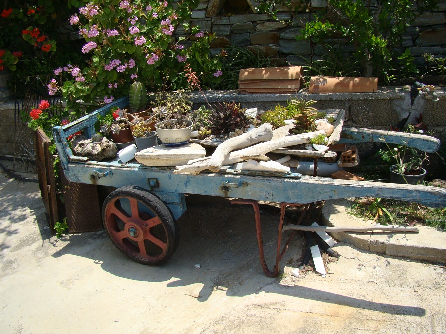 Αλλά και μια παλιά καρέκλα-γλάστρα! Και ένα καρότσι από αυτά που παλιά μεταφέρανε τις βαλίτσες στο λιμάνι γεμάτο με γλάστρες! Και μια γλάστρα χτισμένη στον παραπέτο της βεράντας! Και μια άλλη γλάστρα χτισμένη σε διακοσμητικό κοίλωμα του τοίχου!