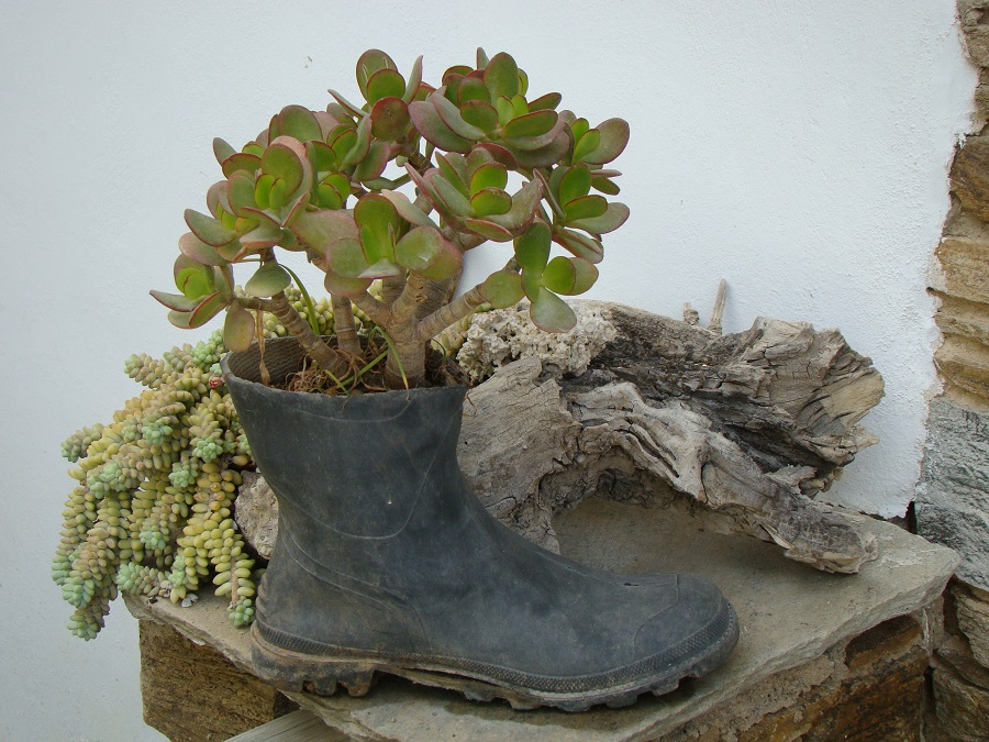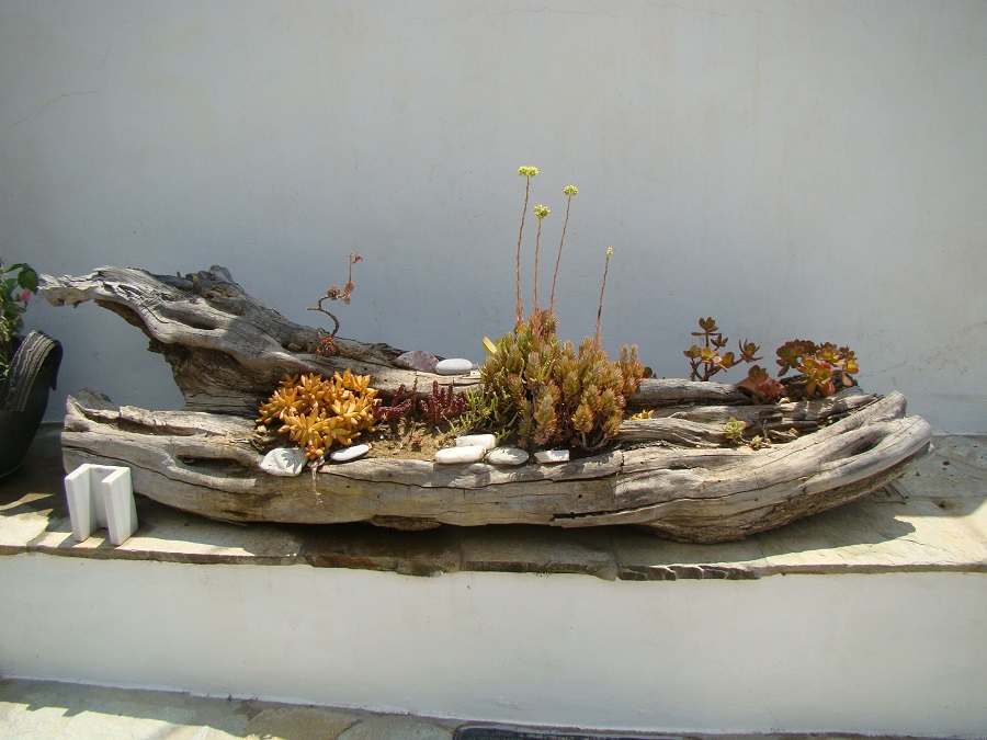 Αν νομίζεις πως εκεί τέλειωσαν οι εκπλήξεις είσαι γελασμένος! Η επόμενη έκπληξη είναι μια παλιά γαλότσα-γλάστρα! Και μετά δεκάδες πέτρες με μικρά κοιλώματα-γλάστρες. Και ένα ζεμπίλι-γλάστρα! Και μια κουφάλα ενός κορμού-γλάστρα.