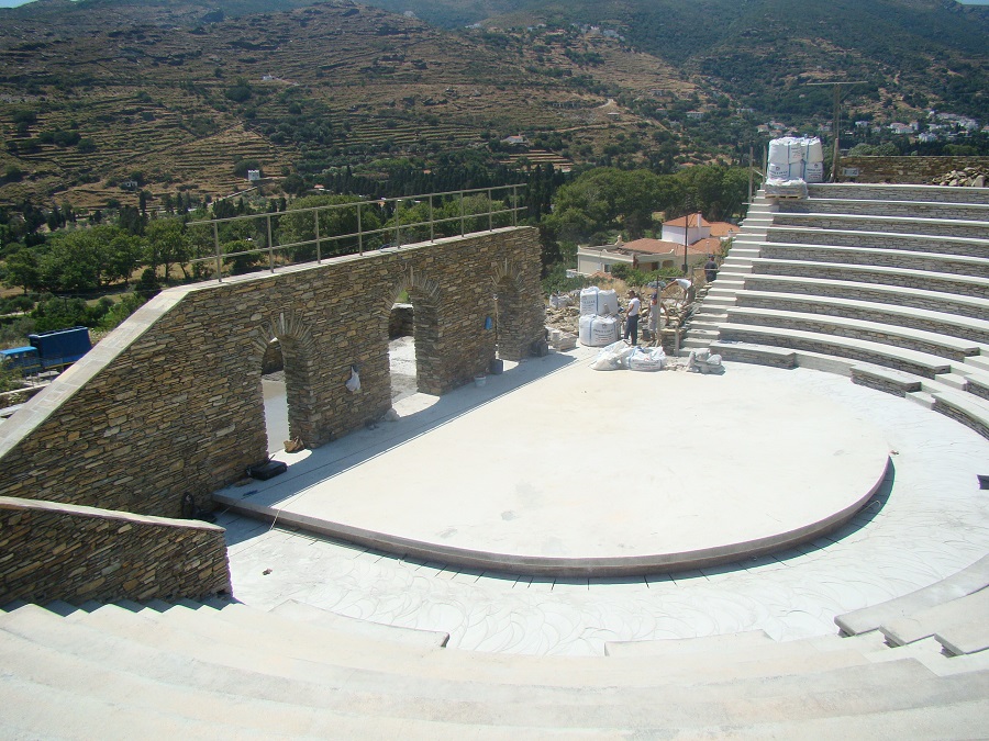 Η σκηνή, οι θέσεις των θεατών, τα καμαρίνια των ηθοποιών, οι είσοδοι, το κυλικείο, τα εκδοτήρια εισητηρίων, οι κήποι, κλπ. Όλα σχεδόν στη θέση τους, Το θέατρο πλέον έχει σχηματοποιηθεί στην τελική μορφή του. Και είναι στην τελική ευθεία. Ένα μεγάλο έργο ολοκληρώνεται στην Άνδρο από ανδριώτες τεχνίτες. Σε λίγες περιπτώσεις κλήθηκαν συνεργεία από Αθήνα.