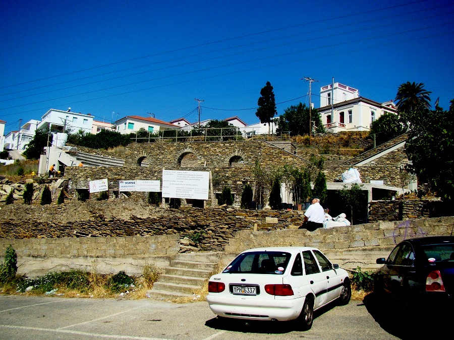 Κυριακή πρωί. Το θέατρο από το πάρκινγκ του σχολείου. Σχεδόν δεν φαίνεται. Τόσο ενταγμένο στο περιβάλλον είναι. Ο κ.υριος με το άσπρο πουκάμισο πάνω στην πέτρινη μάντρα είναι ο Αλκιβιάδης Τάττος! Είπαμε μόνο έτσι τελειώνουν γρήγορα μερικά σημαντικά έργα στην Ελλαδα. Κάποιος πρέπει να το "τρέχει"...