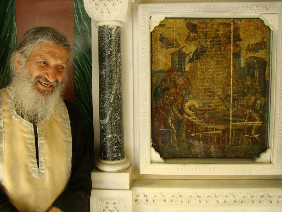 Ο παπά-Κώστας εφημέριος της Κοιμήσεως της Θεοτόκου στη Σύρο μπροστά στην εικόνα του Θεοτοκόπουλου (φωτο: "εν Άνδρω")