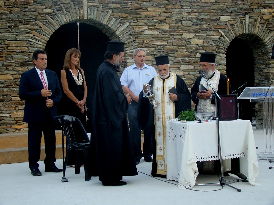 Αρχικά έγινε αγιασμός από τον παπά-Γιάννη Στάμο με την συνοδεία δύο ιερέων. Στη συνέχεια τον λόγο πήρε η Αθηνά Τσατσομοίρου ως υπεύθυνη εκ μέρους του Δήμου Άνδρου και καλωσόρισε με έναν περιεκτικό λόγο τον κόσμο. Στη συνέχεια ο δήμαρχος Θεοδόσης Σουσούδης έκανε μια σύντομη αναφορά στην κατασκευή του θεάτρου και στον χορηγό και στους προκατόχους του που αγκάλισαν την ιδέα. Μετά ο χορηγός, Αλκιβιάδης Τάτος, συγκινημένος έκανε την δική του αναδρομή μιλώντας για τις προσπάθειες και για την συνεισφορά όλων των συντελεστών που όλα αυτά τα χρόνια μελέτησαν, σχεδίασαν, έτρεξαν, για να ξεκινήσει το έργο και στο τέλος επέβλεψαν και την κατασκευή του.