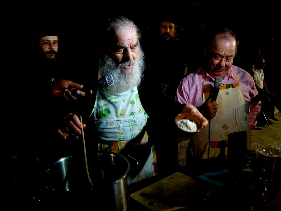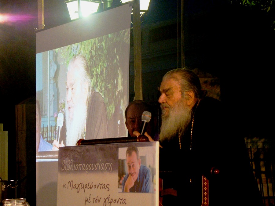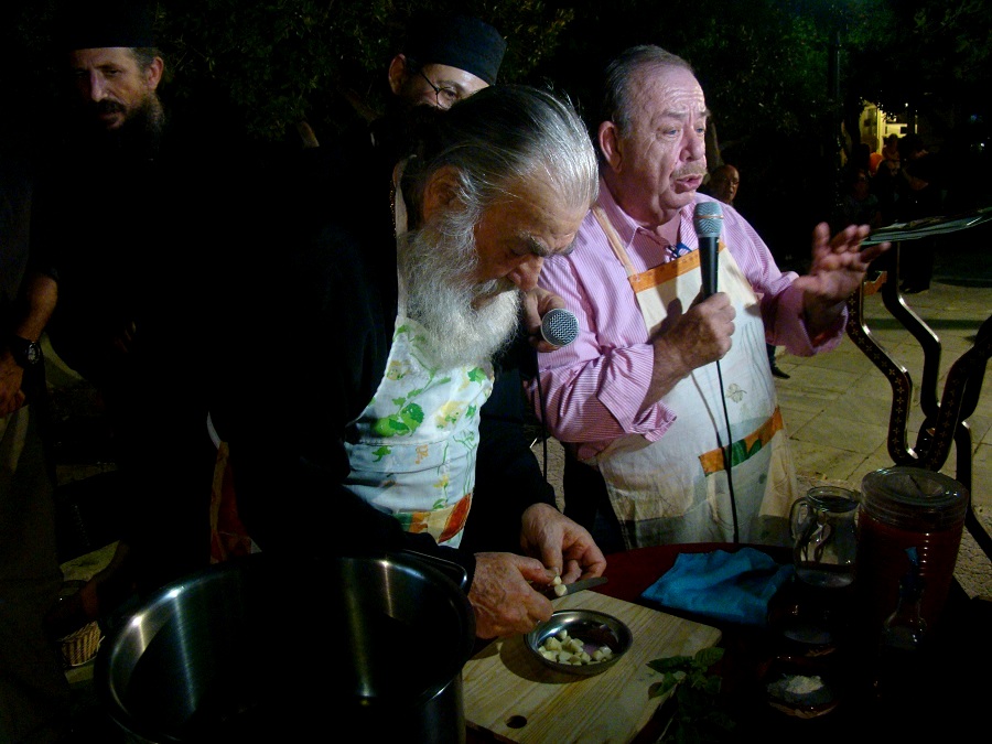 Κατά τα άλλα το απόβραδο μιας πολύ ζεστής μέρας στην πλατεία Γηροκομείου που γέμισε από την μια άκρη μέχρι την άλλη για πρώτη φορά κοντά 1000 άνθρωποι άκουσαν το καλωσόρισμα του ηθοποιού Πατρίκιου Κωστή, τον σύντομο χαιρετισμό του δημάρχου Θεοδόση Σουσούδη, την περιεκτική ομιλία του γνωστού από την τηλεόραση μάγειρου Ηλία Μαμαλάκη, που προλόγισε το βιβλίο και τις ευχαριστίες προς όλους του Ευδόκιμου. Και μετά παρακολούθησαν το μαγείρεμα της διάσημης σάλτσας της πασίγνωστης μακαρονάδας που σερβίρει χρόνια τώρα στους επισκέπτες του μοναστηριού ο γέροντας. Τέλος, πατέρας Αέτιος ευχαρίστησε τον κόσμο που στάθηκε η αφετηρία, από την αρχή μέχρι το τέλος, αυτής της μοναδικής στα χρονικά λαοσύναξης…