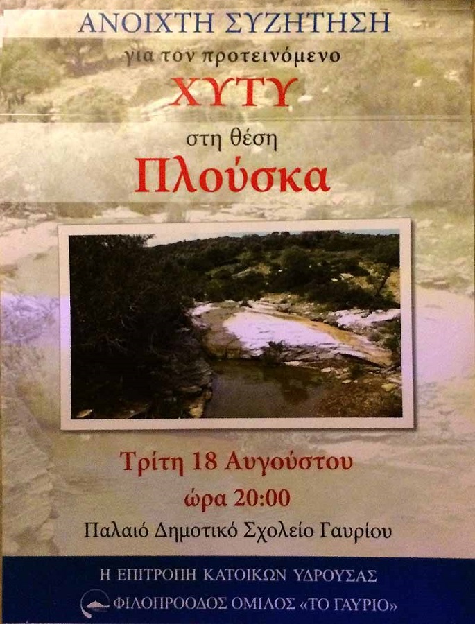 18/8 ΓΑΥΡΙΟ: Συζήτηση για την Πλούσκα στο Γαύριο από τον Φιλοπρόοδο Όμιλο και την Επιτροπή της Υδρούσας