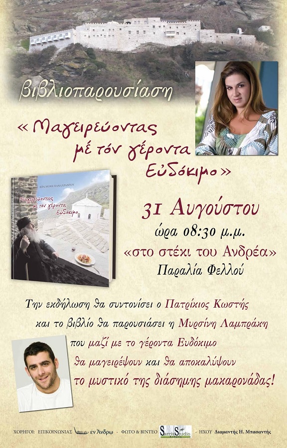 Είναι η τρίτη παρουσίαση του βιβλίου "Μαγειρεύοντας με τον γέροντα Ευδόκιμο". Του βιβλίου που έγινε "best-seller" εφέτος το καλοκαίρι στην Άνδρο και που σε δύο μεγάλες παρουσιάσεις στο Κόρθι (400 θεατές/ακροατές) και στην Χώρα (1000 θεατές/ακροατές) είχαν την ευκαιρία να μάθουν από πρώτο χέρι τη διααημη συνταγή της σάλτσας για μακαρονάδα. Στο Στέκι του Ανδρέα προσκαλέθηκε ο Ευδόκιμος και θα γίνει η παρουσίαση που είναι για την Υδρούσα. Όσοι πιστοί της μακαρονάδας προσέλθετε. "εν Άνδρω"