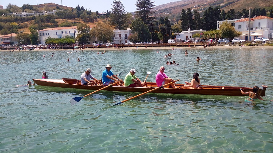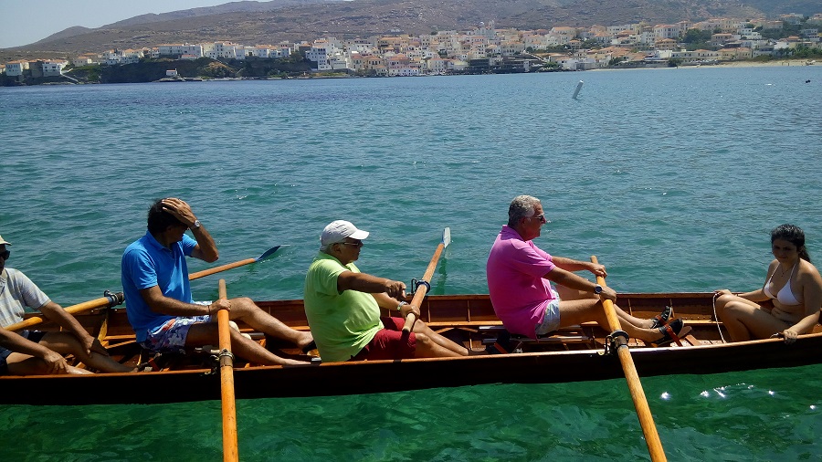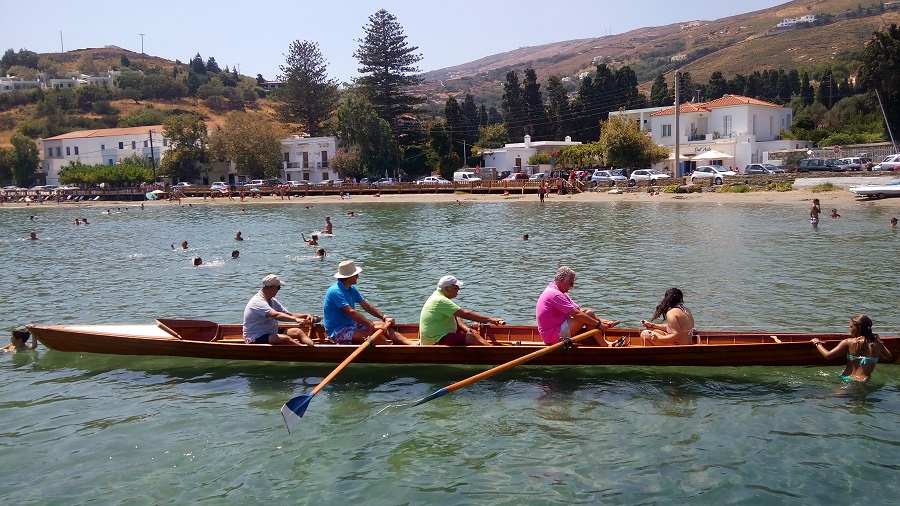 Για μια ακόμα χρονιά οι παλαίμαχοι κωπηλάτες τοτ Ναυτικού Ομίλου Άνδρου κατέβασαν τις βάρκες από το ράφι και τις έριξαν στη θάλασσα. Τα παλιά ξυλινα σκαριά που συντηρούνται με αγάπη βρέθηκαν στο νερό. Μέσα μπήκαν τέσσερις από τους παλιούς κωπηλάτες: Εξαδάκτυλος, Κέτσης, Σίμπουρας και Κοκκίνης. Τιμονιέρισα η κόρη του Μαρκουϊζου.