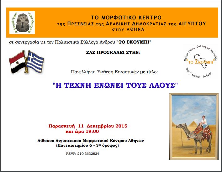 Ο ανδριώτικος πολιτιστικός σύλλογος "Το Σκουμπί" με μια ενδιαφέρουσα διαδρομή και με έδρα το Άνω Γαύριο και το Κουμάρι (παρακάτω ένα σύντομο ιστορικό του) διοργανώνει σειρά εκδηλώσεων κάθε καλοκαίρι στο Γαύριο, αλλά κάθε χειμώνα διοργανώνει εκθέσεις ζωγραφικής στην Ελλάδα και στο εξωτερικό με θέμα: Η Τέχνη του Αιγαίου ταξιδεύει". Στα πλαίσια των εφετεινών χειμερινών δραστηριοτήτων του διοργανώνει έκθεση στην πρεσβεία της Αιγύπτου από 11 μέχρι 18 Δεκεμβρίου 2015. Παρουσιάζονται 28 έλληνες εικαστικοί καλλιτέχνες. Αναλυτικά: