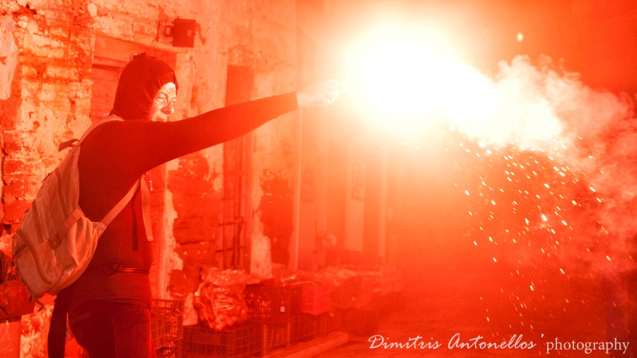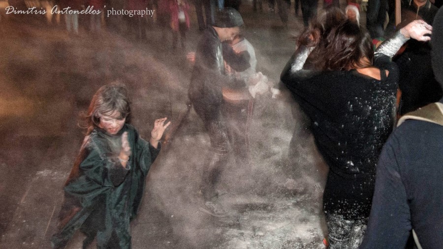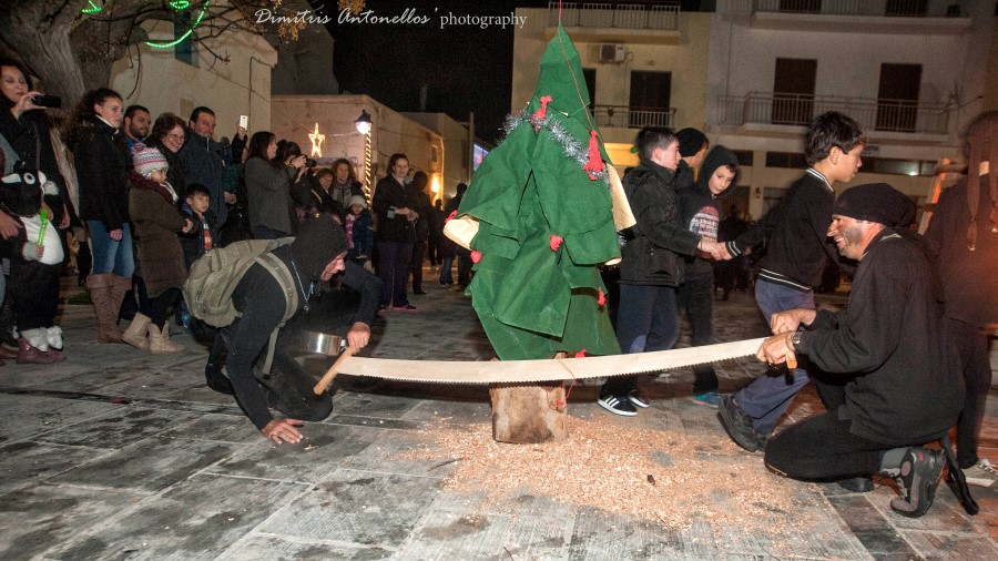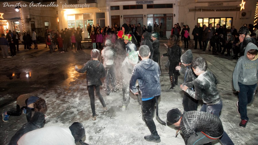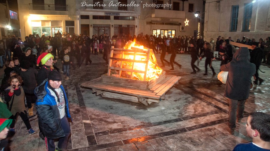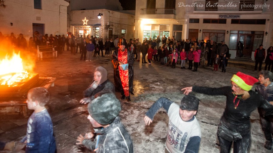 Αφού πέρασαν από όλα τα μαγαζιά και άφησαν πίσω τους έναν χαμό, κατέληξαν στην πλατεία όπου άναψαν μια τεράστια φωτιά , χόρεψαν γύρω της και παίξανε αλευροπόλεμο! Εκεί ήταν και το δέντρο της γης (παραλλαγή του μυθικού Άτλαντα), όπου όλο το χρόνο μέχρι τα Χριστούγεννα έκοβαν με τα πριόνια τους.