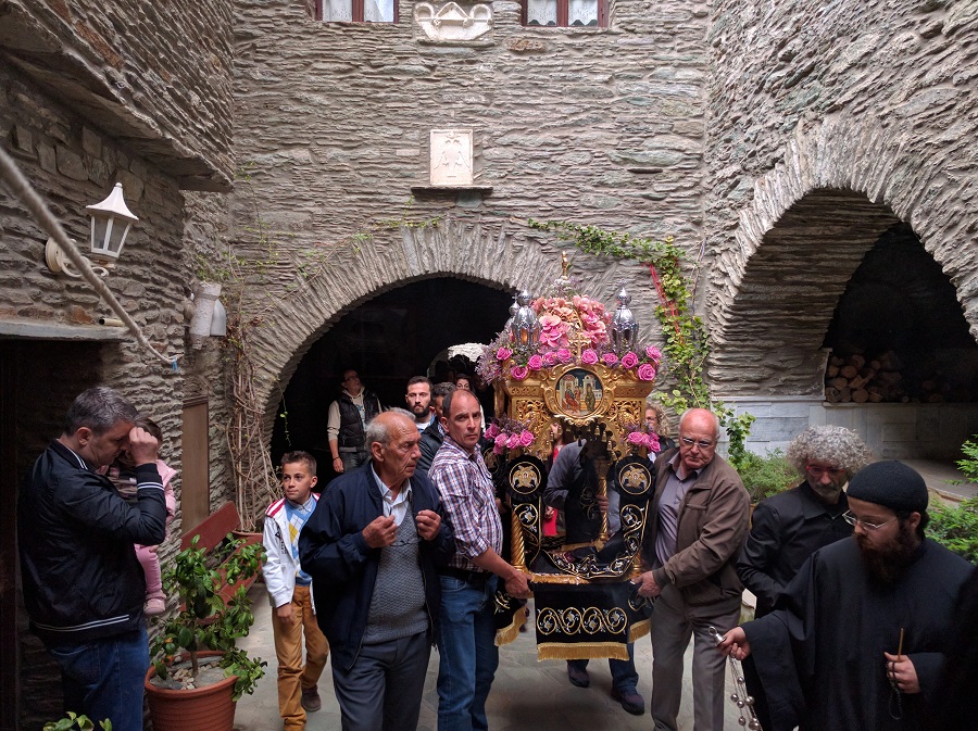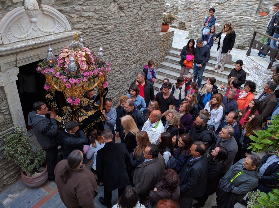 Στο νέο μπαλκόνι της Μονής Παναχράντου κάτω από τον λιτό και επιβλητικό σταυρό ο επιτάφιος. Μια σκηνή ιστορίας και πάλι. Ο επιτάφιος αρχαιοελληνική αναφορά που πέρασε στην χριστιανική παράδοση. Όπως γράφει ο Σεφέρης στην αρχαιότητα αυτές οι υπέροχες γιρλάντας των λουλουδιών συμβόλιζαν τον γύρο της άνοιξης που έφερνε ο Άδωνης. Στον χριστιανισμό συμβολίζουν τον γύρο της ζωής που φέρνει ο Χριστός... Το ορθόδοξο τελετουργικό ακουμπά πάνω στην αρχαία αναφορά γράφει ο σπουδαίος Γ. Σεφέρης...
