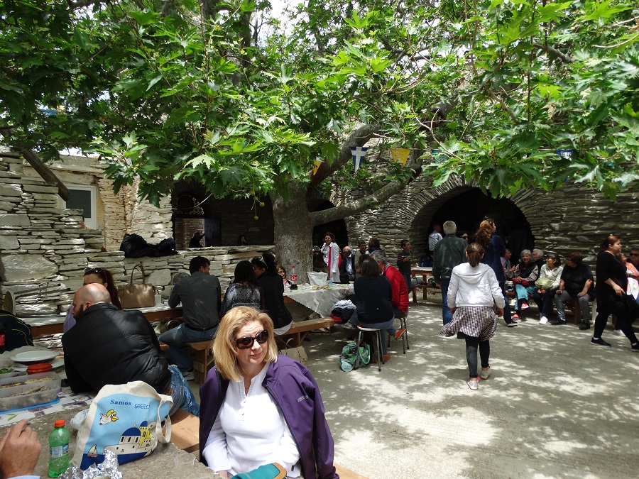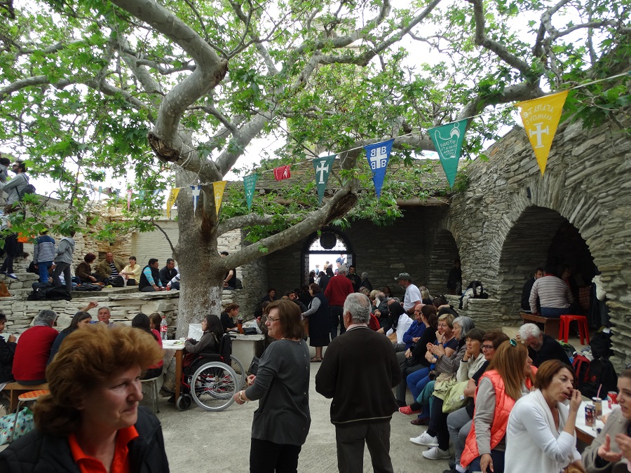 Οι άλλες κάθονται εξώ και απλώνουν κι αυτές τα φαγητά που έφεραν αό το σπίτι. Μαζί με τους φιλοξενούμενους και τους φίλους τους...