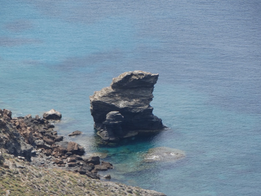 Κάτω από τα πέτρινη ακτογραμμή ένα τεράστιος βράχος ξεχωρίζει επιβλητικός. Μια εικόνα σαν απο ποίημα. Η άγρια ομορφιά του τοπίου ολοκληρώνεται με τον ξεχωριστό αυτό βράχο μέσα στην θάλασσα...