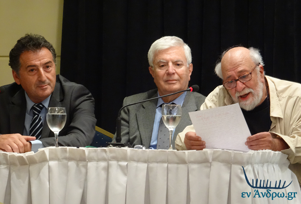 Ο Π. Βούλγαρης παρουσιάζοντας το 2ο Φεστιβάλ Άνδρου. Δίπλα εξ αριστερών οι Θ. Σουσούδης και Κ. Κουτσομάλης.