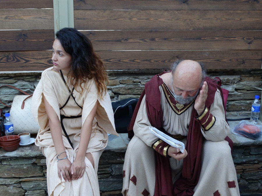 Δύο στιγμές στα παρασκήνια από την προετοιμασία της παράστασης. Πάνω ο Βασίλης Πομόνης μελετά τον ρόλο του. Κάτω ο Βαγγέλης Ψαριανός δίνει τον ρυθμό στην μουσική (φωτο: Εν Άνδρω)