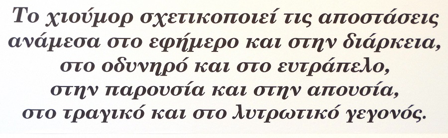 Και μιας και το χιούμορ σχετικοποιεί τις αποστάσεις ανάμεσα στο εφήμερο και στην διάρκεια (όπως γράφει και η Αθηνά...) είπαμε να δούμε με χιούμορ πως προβάλουμε τόσα λίγα έργα γιατί τόσο λίγο μας επέτρεψε η ΔΕΗ που πριν ξεκινήσουμε την επίσκεψη στην έκοεση... έκοψε το ρεύμα!!! Έτσι ότι είδαμε-είδαμε πριν ξεκινήσει η συνέντευξη που κι αυτή τέλειωσε στο σκοτάδι!!! Αυτά για να μην αναρωτιέστε τι έγιναν οι υπόλοιποι από τους 14 καλλιτέχνες...