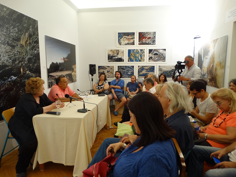 Η δημιουργός ενός έργου με τα έργα... των άλλων. Η καθηγήτρια και τεχνοκριτικός Αθηνά Σχινά στην συνέντευξη τύπου. Δίπλα στην δημιουργό που αναδεικνύει.... δημιουργούς ο πρόεδρος του Ιδρύματος Κυδωνιέως, που είναι βασικός χρηματοδότης της έκθεσης (φωτο: Εν Άνδρω).