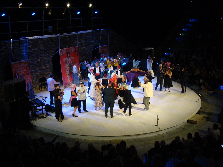 Πρώτη φορά... κλασική ελληνική επιθεώρηση στο ανοιχτό θέατρο Άνδρου! Άλλη μια πρωτιά στις πρωτιές της εποχής μας! Η ερασιτεχνική παράσταση, με αρκετούς επαγγελματίες, "κάνε κουράγιο Ελλάδα μου" που σκηνοθέτησε ο Γιώργος Δάμπασης. Καλοσυραμμένα κείμενα, ροή, χορευτικά και έξυπνες ατάκες με αναφορά στην Άνδρο. Όλα αυτά κέρδισαν το ενδιαφέρον των εκατοντάδων θεατών που παρακολούθησαν την παράσταση. Εδώ το χορευτικό στο φινάλε (φωτο: Εν Άνδρω).