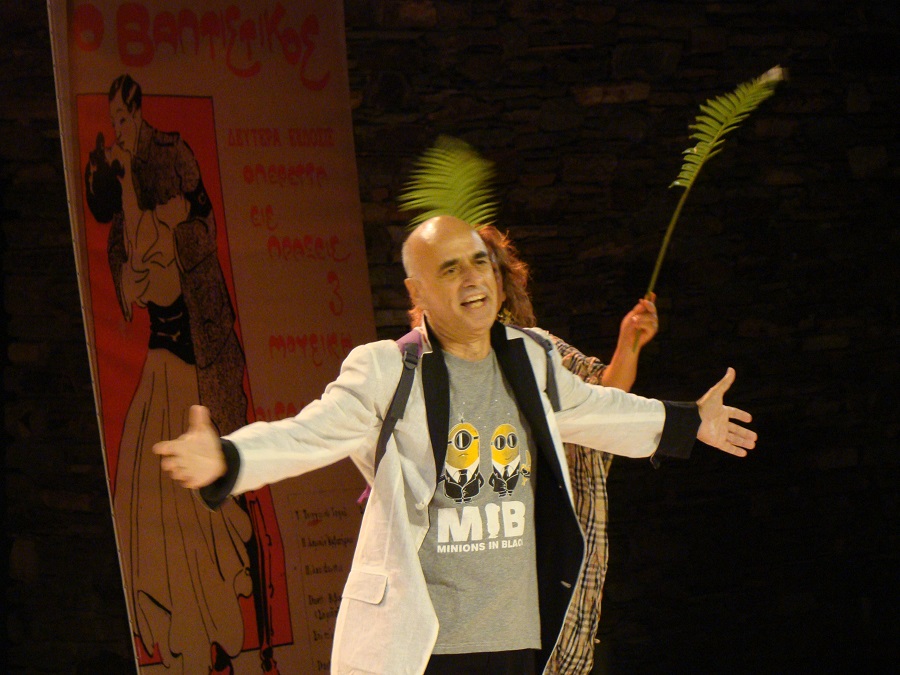 Και κάπου εδώ μπαίνει ένα από τα πιο σπαρταριστά νούμερα: ο Βαρουφάκης!!! Ένα εξαιρετικό κείμενο που έφερε πολύ γέλιο. Ο "Βαρουφάκης" της παράστασης με φανελάκι, σακάκι με σηκωμένο γιακά και σακίδιο!!! Και το σκετς τελειώνει με τον Βαρουφάκη να φεύγει με σηκωμένο δάχτυλο!!! (φωτο: Εν Άνδρω).