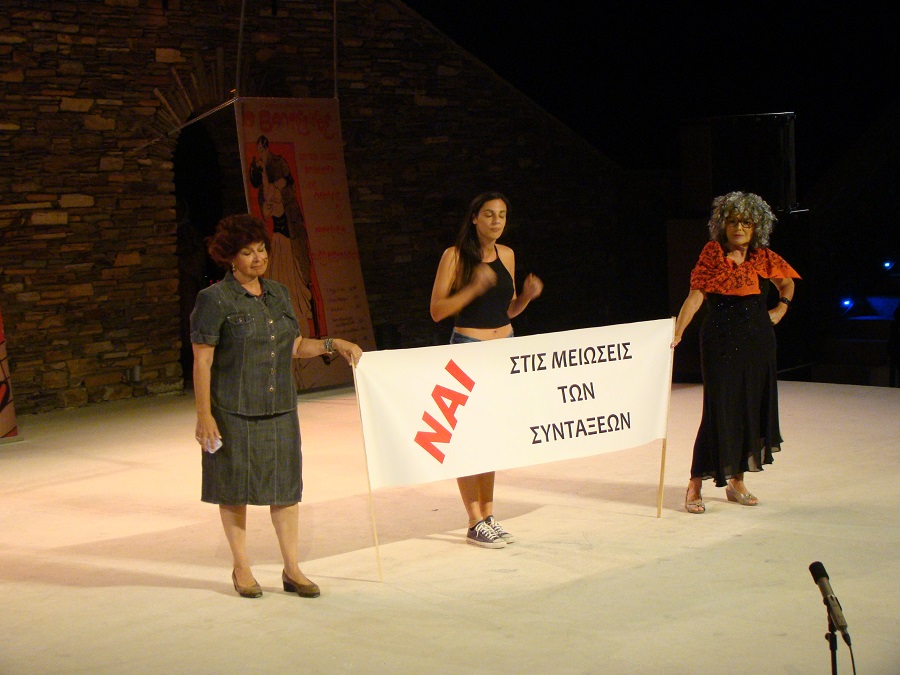 Και μετά φεύγει το "μαύρο" από την ΕΡΤ και μπαίνει πάλι στο "παιχνίδι" η δημόσια τηλεόραση. Αλλά μοιάζει λίγο μπερδεμένη η νέα ΕΡΤ όταν διαπιστώνει πως πια κανείς δεν διαμαρτύρεται για τις μειώσεις των συντάξεων!!... Από το αντίστοιχο σκετς της παραστασης... (φωτο: Εν Άνδρω).