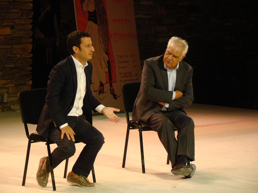 Φυσικά δεν μπορούσε να λείπει "ο Αλέξης" σε ρόλο σούπερ-σταρ! Τι επιθεώρηση θα ήταν αν δεν σατίριζε την εξουσία άλλωστε; Εδώ στιγμιότυπο από την παράσταση όπου ο "Αλέξης Τσίπρας¨συζητά για επενδύσεις με τον "Μπιλ Κλίντον"!!! (φωτο: Εν Άνδρω).
