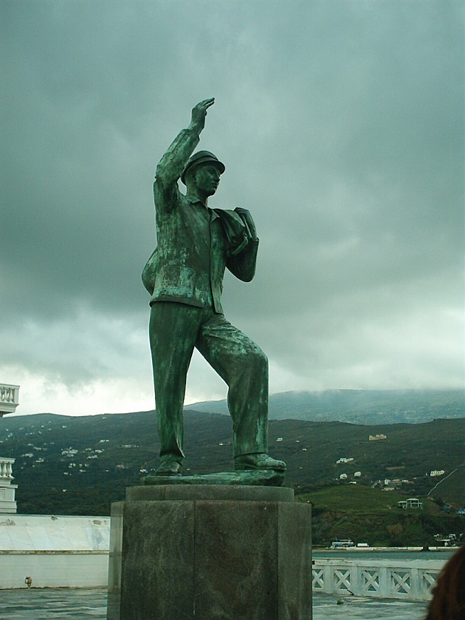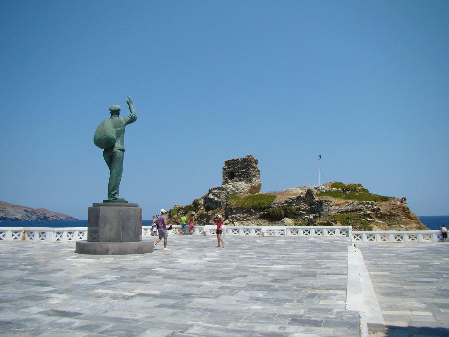 Ο ανδριώτης Αφανής Ναύτης στην ομώνυμη πλατεία στην άκρη της Χώρας αποχαιρετά το νησί και φαίνεται να φεύγει ταξίδι (φωτ. Εν Άνδρω).