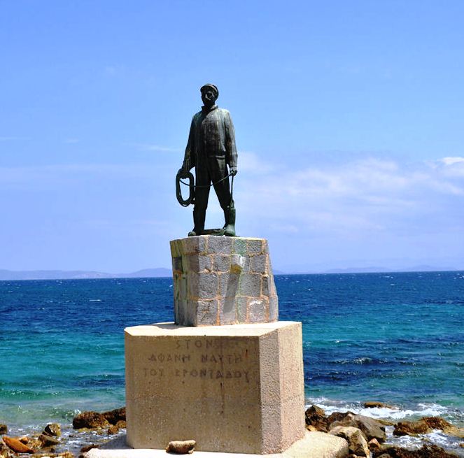 Ο ανδριάντας του Αφανή Ναύτη. Με την δυναμική της κίνησης που του προσέδωσε ο Μιχάλης Τόμπρος το άγαλμα απέκτησε θεατρικότητα (φωτ. Εν Άνδρω).