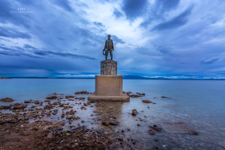 Καθώς διασχίζει κανείς το παραλιακό δρόμο του Βροντάδου, μιας κωμόπολης 4 χιλιόμετρα από το λιμάνι της Χίου, θα συναντήσει στη πλευρά της θάλασσας, μια μικρή στρογγυλή πλατεία. Στην άκρη μέσα από τη θάλασσα ξεπροβάλει ένας μπρούτζινος ναύτης, σε μέγεθος μεγαλύτερο του φυσικού, πάνω σε βάση σχήματος πλώρης πλοίου που βρίσκεται σε υπερυψωμένο τσιμεντένιο βάθρο στην άκρη του κύματος. Το βλέμμα του ναύτη είναι στραμμένο στη στεριά. Τον ανδριάντα φιλοτέχνησε ο ανδριακής, εκ μητρός, καταγωγής Θανάσης Απάρτης.