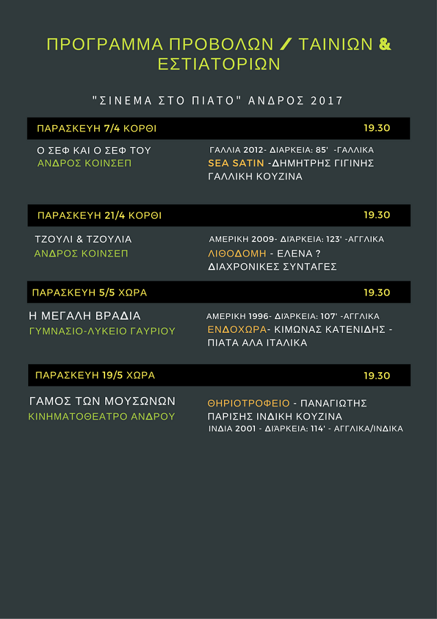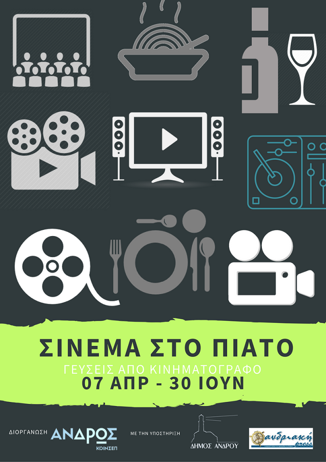 (Μια εντελώς πρωτότυπη ιδέα από την ΚΟΙΝΣΕΠ έφτασε στο γραμματοκιβώτιο μας σήμερα. Διαβάστε την και δεν θα χάσετε: ένα ιδιαίτερο πιάτο σε ένα διαφορετικό κάθε φορά εστιατόριο της Άνδρου μαζί με μια ταινία. Ξεκινά την Παρασακευή 7 Απριλίου και φτάνει μέχρι τον Ιούνιο. Εντελώς ΠΡΩΤΟΤΥΠΟ – Εν Άνδρω)