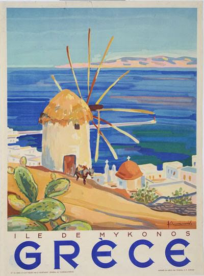 Η πρώτη διαφημιστική αφίσα της Μυκόνου την ίδια εποχή. Από τότε η αναφορά στους μύλους (σταθερή διαχρονική τουριστική αξία) και στη θάλασσα.