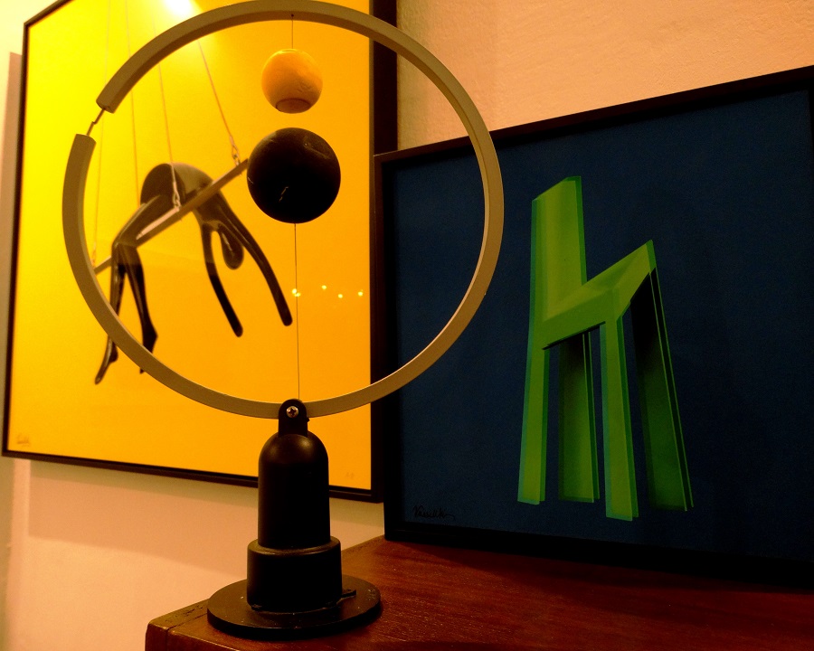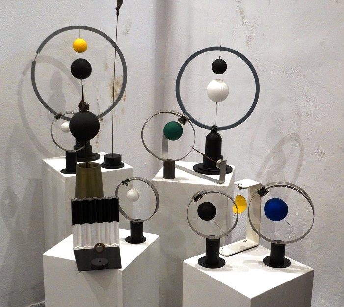 Μαγνητικό γλυπτό του Τάκη - τίτλος antigravity ή αντιβαρύτητα. Πίσω δόο πίνακες τηε διάσημης ελληνίδας εικαστικού Βασιλικής (φωτ. Εν Άνδρω).