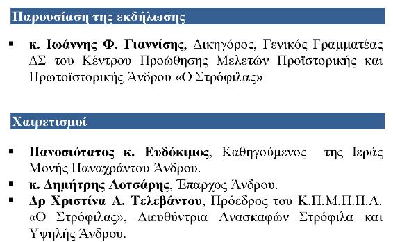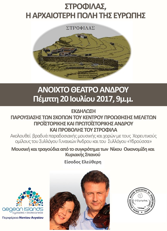 Ο Στρόφιλας, η αρχαιότερη πόλη της Ευρώπης θα παρουσιαστεί κτην Πέμπτη 20 Ιουλίου 2017, στις 9:00 το βράδυ στο Ανοιχτό Θέατρο Άνδρου. Θα ακολουθήσουν νησώτικα τραγούδια και χοροί με τον Νίκο Οικονομίδη, την Κυριακή Σπανού και τους χορευτικούς Συλλόγους Γυναικών και Υδρούσας.