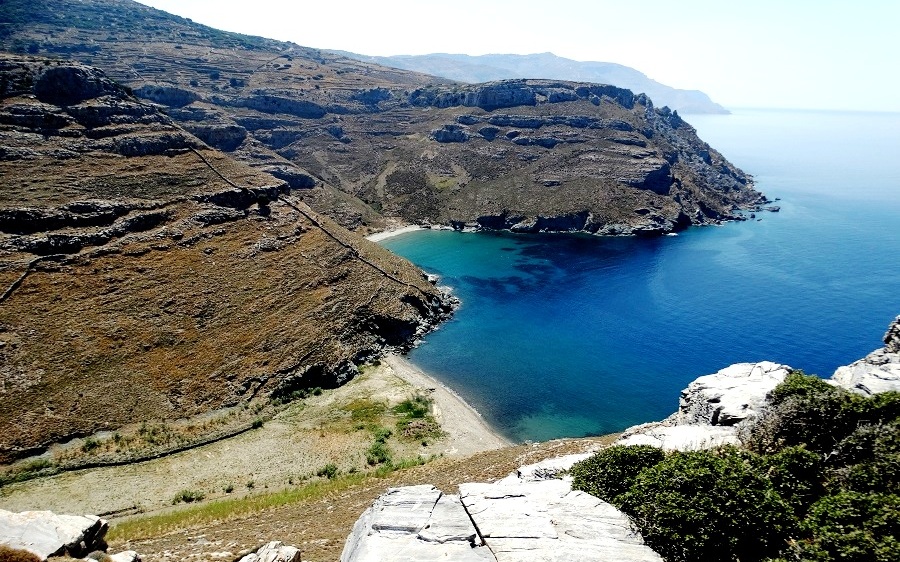 Στο βάθος το οροπέδιο της Ζαγοράς. Κάτω τα αρχαία λιμάνια της Ζαγοράς και του Στρόφιλα. Η φωτογραφία είναι από το οροπέδιο του Στρόφιλα. Δύο από τις σημαντικότερες αρχαιολογικές ανασκαφές των Κυκλάδων. Η μια απέναντι στην άλλη. Δύο ιστορίες σε ένα νησί που ελάχστα γνωρίζει γι άυτές. Μήπως είναι καιρός να τις μάθουμε; (φωτ. Εν Άνδρω).