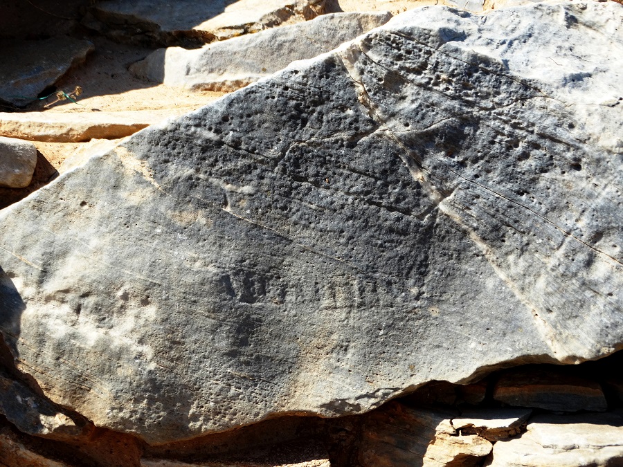 Κυρίαρχη βραχογραφία μια μνημειακή στα ερείπια του κεντρικού κτιρίου του οικισμού που πρέπει να είχε δημόσιο χαρακτήρα, μάλλον ιερό. Ο λόγος για μια επιδαπέδια βραχογραφία 70 τετραγωνικών μέτρων!!! Μαζί μα αυτή και δεκάδες καραβάκια σκαλιστά στους βράχους γύρω από το τείχος του οικισμού. Επιπλέον κεραμικά, αλλά και βραχογραφίες θεοτήτων και άλλων άγνωστων αποτυπώσεων.