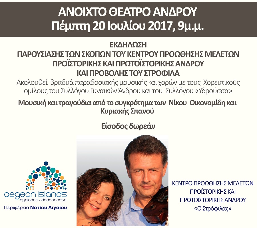 (α) Την Πέμπτη 20 Ιουλίου στις 21:00 - αμέσως μετά την παρουσίαση του Στρόφιλα - μεγάλο μουσικό πρόγραμμα με νησιώτικα από τον Νίκο Οικονομίδη και την Κυριακή Σπανού στο Ανοιχτό Θέατρο Άνδρου. Η είσοδος είναι ελεύθερη (προσφορά της Περιφέρειας Νοτίου Αιγαίου και του Επαρχείου Άνδρου).