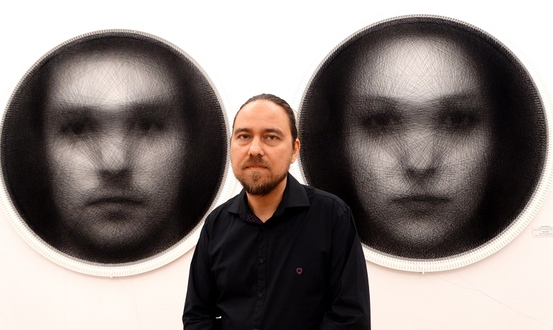 Ο Πέτρος Βρέλλης ανάμεσα στα "ζωγραφικά γλυπτά" του! Τα πρόσωπα που υποκρύπτονται είναι επεξεργασμένες μορφές από πίνακες του Δομήνικου Θεοτοκόπουλου! Ο Π. Βρέλλης δούλεψε πάνω τους με κλωστή! Διαμόρφωσε ένα πλέγμα μέσα από το οποίο το αρχικό πρόσωπο έγινε μνήμη, αναφορά και προβολή. Μνήμη στις ρίζες που άφησε ο Ελ Γκρέκο και αναφορά/ροβολή των σημερινων από το χτες μέχρι το αύριο (φωτ. Εν Άνδρω).
