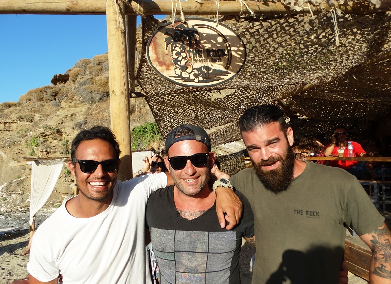 Μόνο που για να γίνει ο βράχος "Rock" και να rockάρουν τα πράγματα έπρεπε ο Χαλάς να βρει συνεταίρο. Τι πιο απλό; Πήγε και βρήκε τον παλιό συμμαθητή του, τον Σάββα Πούμπουρα, που ήταν πια τηλεοπτικός παρουσιαστής στον Alpha στην εκπομπή Blind Taste. Και το εγχείρημα προχώρησε με ολίγη βοήθεια από τον Αλέξη, τον κουμπάρο, που κάθε Παρασκευή αφήνει την τράπεζα που δουλεύει και Rockάρει στο Παραπόρτι. Τώρα για να βγει αυτή η στημένη φωτογραφία των τριών φίλων πέρασε πολύ ώρα μιας και ο Σάββας είχε ξαμολυθεί για ένα βίντεο και χάθηκε... (φωτ. Εν Άνδρω).