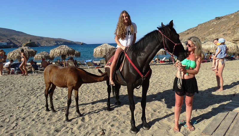 Ευτυχώς όμως που η ώρα πέρασε πολύ ωραία, καθώς ένας άλλος ροκ τύπος έφερε μια φοράδα στην παραλία, την οποία καβάλησε μια όμορφη κοπέλα και μια ακόμα πιο όμορφη μαμά την κράταγε και βγάζανε φωτογραφίες. Ένα ροκ Παραπόρτι, με όλιγό ροκ χρώμα, έκανε την ώρα να περάσει ωραία... (φωτ. Εν Άνδρω).