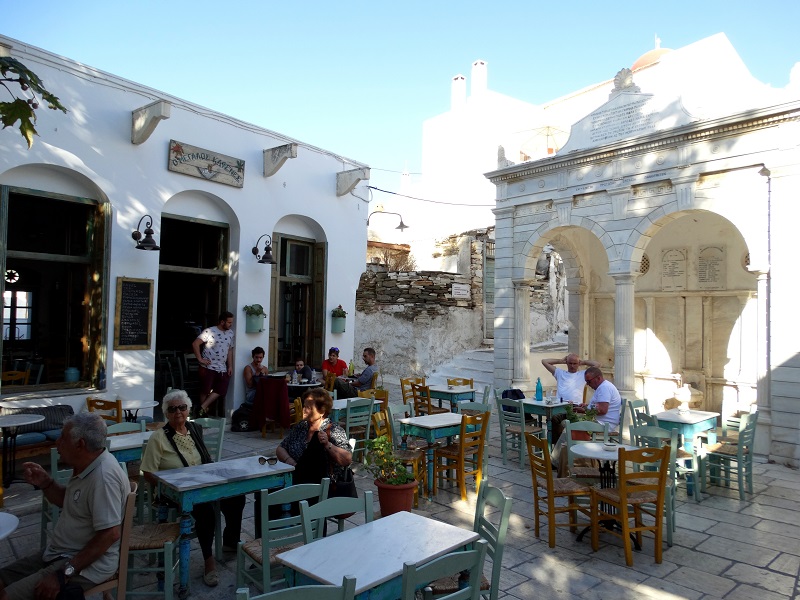 Το ιστορικό καφενείο στην πλατεία του χωριού κάτω από τον γιγάντιο πλάτανο. Δεξιά η μαρμάρινη βρύση με σκαλισμένα σε πινακίδες τα ονόματα των χορηγών και των μεγάλων Τήνιων καλλιτεχνών (φωτ. Εν Άνδρω).