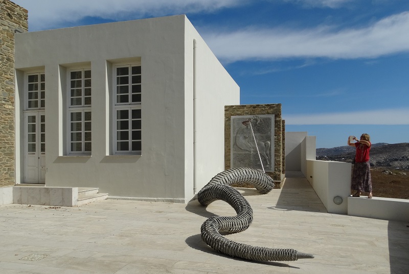 Το ξεχωριστό μουσείο του μεγάλου Έλληνα εικαστικού στον Κάμπο, το οποίο προέκυψε από ένα παλιό δημοτικό σχολείο που ανασκευάστηκε. Εδώ ο Άγιος Γεώργιος και το φίδι σε μια μοντέρνα σύνθεση (φωτ. Εν Άνδρω).