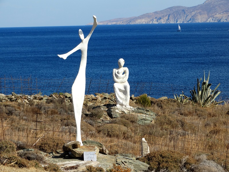 Μορφές πάνω στο σκληρό τοπίο. Πίσω το πέλαγος και η Μύκονος. άλλη μια φωτογραφία από την υπαίθρια γλυπτοθήκη του Φ. Γρυπάρη έξω από την Χώρα της Τήνου (φωτ. Εν Άνδρω).