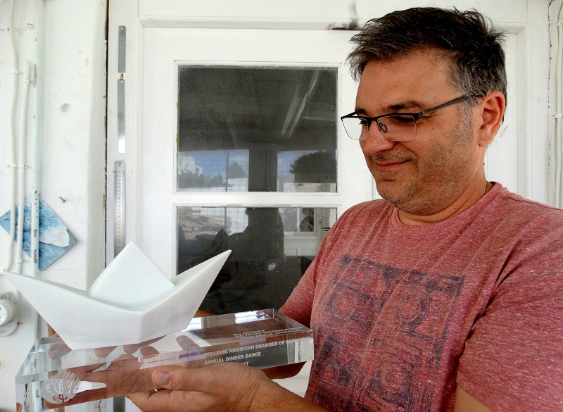 Ο Πέτρος Μαρμαρινός, ένας σύγχρονος γλύπτης που ζει και εργάζεται στον Πύργο. Εκεί έχει το εργαστήρι του και την έκθεση του. Εκεί τον βρίσκουν και του παραγγέλνουν έργα του. Το εικονιζόμενο μαρμάρινο καραβάκι θα ταξιδέψει στη Νέα Υόρκη και θα δοθεί ως βραβείο σε μεγάλη επιχειρηματική γιορτή (φωτ. Εν Άνδρω).