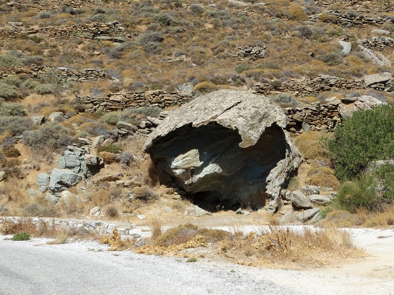 Τη μορφή του ηφαιστειακού βράχου στον δρόμο για τα Υστέρνια και τον Πύργο, την έχει σμιλέψει η φύση με τρόπο που ξαφνιάζει και για το μέγεθος και για το σχήμα (φωτ. Εν Άνδρω).