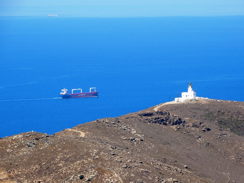Το εμπορικό πλοίο προσπερνά αργα τον φάρο της Φάσας. Η "ουράνια γαλήνη" του τοπίου μοναδική (φωτ. Εν Άνδρω).