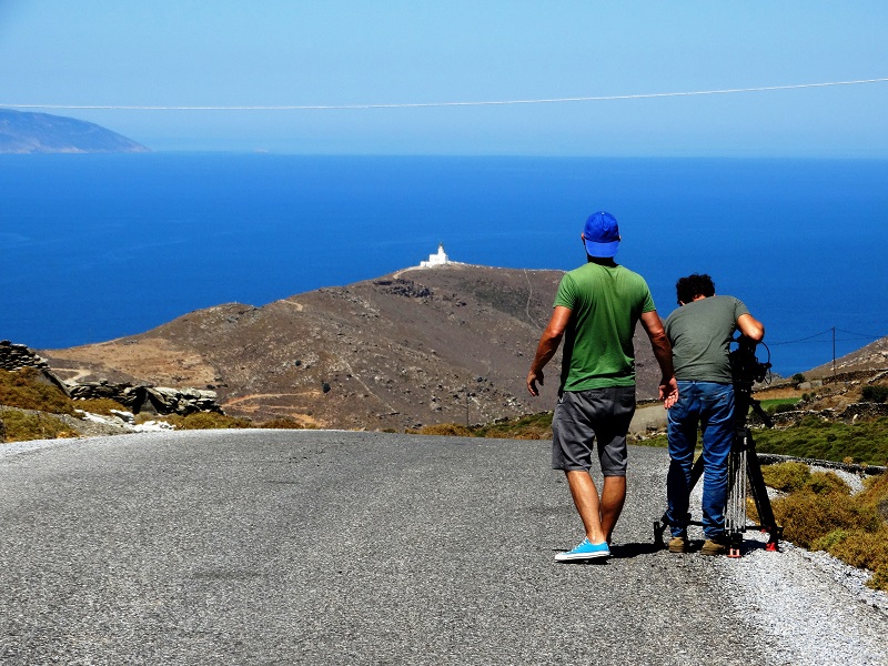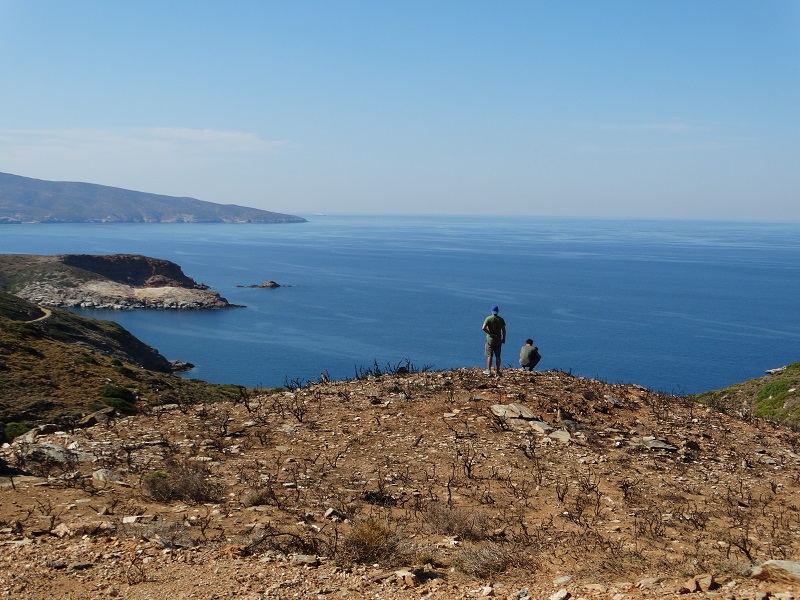 "Εδώ, εδώ" είπε ο Γάλλος δημοσιογράφος Alexis του ARTE. Σταματήσαμε. Εντυπωσιασμένος από τη θέα προχώρησε με τον κάμεραμαν Theo. 'Αρχισαν να βιντεοσκοπούν το τοπίο. Ο Alexis είχε μια εκπληκτική αντίληψη και επελέγε πάντα το καλύτερο σημείο για βιντεοσκόπηση. Πίσω του καταγράφαμε κι εμείς το δικό μας οδοιπορικό (φωτ. Εν Άνδρω).