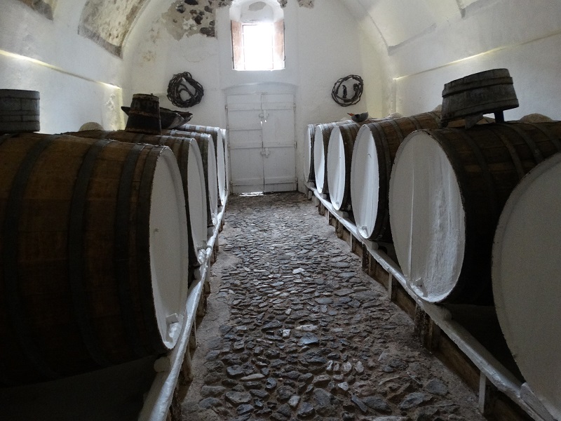 Βαρέλια με κρασί στο υπόσκαφο χώρο του παλιού οινοποιίου Η οινοποιία Βενετσάνο ηταν η πρώτη που εμφιάλωσε κρασί στη Σαντορίνη το 1967 (φβτ. Εν Άνδρω).