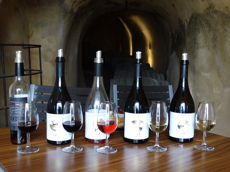 Τα πέντε διαφορετικά κρασιά της οινοποίιας Βενετσάνο και μπροστά τα ποτήρια για τη δοκινή (φωτ. Εν Άνδρω).