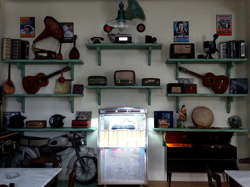 Σε μια άκρη του καφενείου-ουζερί δεκάδες παλιά αντικείμενα. Συλλέκτης ο Λουκάς δεν άφησε παλιό ραδιόφωνο, πικ απ και τζουκ-μποξ που να μην έχει. Και σε μια άκρη ένα ελληνικής πατέντας μηχανάκι του 1953!! Σκηνικό και πραγματικότητα μπερδεύονται. Σα να έχεις πιεί μισό μπουκάλι ούζο, ενώ δεν έχει βάλει σταγόνα στο στόμα σου. Εν τω μεταξύ η μεθυστική ευωδία του γλυκάνισου και των άλλων αρωματικών να σου σπάει τη μύτη (φωτ. Εν Άνδρω).