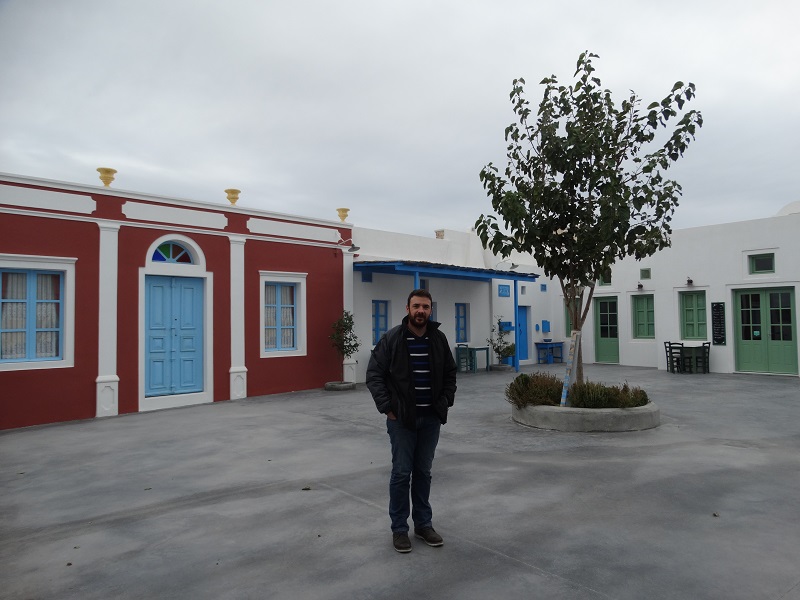Μετά στην αυλή. Η έκπληξη πολλαπλασιάστηκε. Μια αναπαράσταση μεγάλη πλατείας χωριού ή μικρής πόλης στη δεκαετία του '50 ή του '60. Όλα γύρω ένα χτισμένο σκηνικό. Με εξαίρεση το πράσινο καφενείο στο βάθος. Αυτό είναι πραγματικό. Ενας υπέροχος εσωτερικός χώρος που χωρά αρκετές δεκάδες ανθρώπους. Όταν ο καιρός είναι καλός βγαίνουν τα τραπεζάκια έξω και γίνονται γάμοι, δεξιώσεις, συναθροίσεις. Όταν είναι κακός πίσω στο καφενείο. Το ούζο και η τσικουδιά εκτός από την ιστορία χρειάζονται και το ανάλογο σκηνικό. Και στη Σαντορίνη κανείς μπερδεύει την πραγματικότητα μιας ιστορίας και τον μύθο της ζωής μας. Στη φωτογραφία ο Λουκάς στη μέση της πλατείας του (φωτ. Εν Άνδρω).